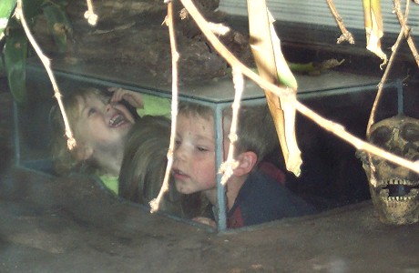 The Tropikariet is on the 2nd and 3rd floors of a warehouse building, and they’ve done an excellent job with it. There was a crocodile hole that the kids could crawl into, next to the caiman pool and pop their heads up in a plexiglass box to be eye-to-eye with the reptiles. There were snakes and lots of big icky tropical bugs, and little monkeys (tamarin type, mostly) and iguanas and parrots and ring-tailed lemurs that sat above our head and jumped within touching distance. They had one big room filled with sand and a row of spades and brushes that the kids could use to dig for dinosaur bones. That was a big hit, and we had to go back in there twice for extra digging. They had about 9 different bones buried in the sand, and a big dino footprint fossil. The Australia room was a little strange because they had rabbits. I know they have rabbits in Australia and that they are, in fact, a pest there. But I don’t think any really respectable zoo counts RABBITS among their tropical animals 🙂