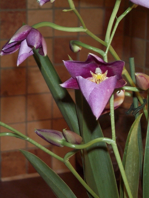 It wasn’t roses…it was an orchid. I like orchids a lot but I can usually only keep them alive for a few months, which makes me sad. This is a really cool orchid, too, I’ve never seen one like it. It has a purple, triangular pocket and a fangy fringe of points hanging down to cover it. My picture of it isn’t nearly as spectacular as the orchid prints that redpirk posted today, though! 🙂