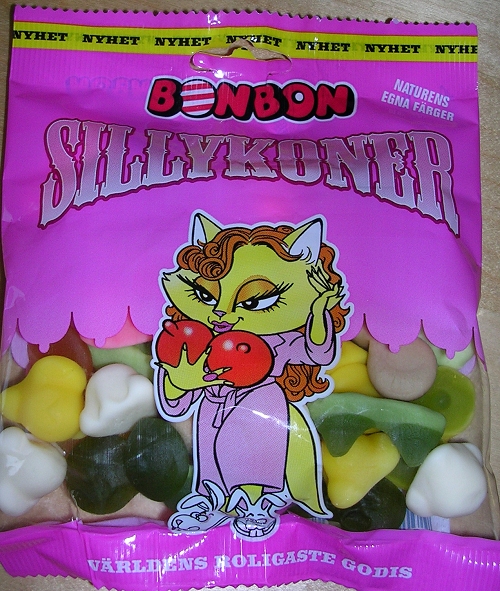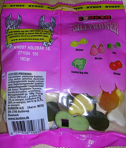 This is the illustration on the front of a bag of gummi candies shaped like breasts. It’s marketed by a company called BonBon from Denmark, the ones that apparently run BonBonLand, but I couldn’t find much information about this particular candy on their website, although they claim to manufacture “the funniest candy in the world.”