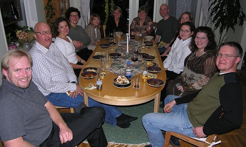 Our guest list of 17 adults and 11 children was pared down by partytime to 13/7. We had asked everyone to please bring an appetizer or dessert, and we provided 3 big pots of chili (spicy, non-spicy and vegetarian) accompanied by heaping bowls of grated cheese, crème fraîche (mmm…crème fraîche!), Fritos, and Russell’s home-made cornbread for fixin’s. I made a hot artichoke dip and Kathey made her 7-layer bean dip. Angie brought creamy crab nachos. Barbara brought gingerbread cake. Laurie brought peanut butter and chocolate cookies. The guests started arriving at 6 p.m. and we had a hilarious, fun-filled evening laughing and chatting and singing and enjoying the company and the great food. A bottle of Russian chili vodka made an appearance at some point and Anders rolled out some of his repetoire of vulgar limericks at Kathey’s behest. Our dinner parties provide something for everyone! 😀 The kids even got to jump on the trampoline late at night with a big spotlight rigged up on the deck.