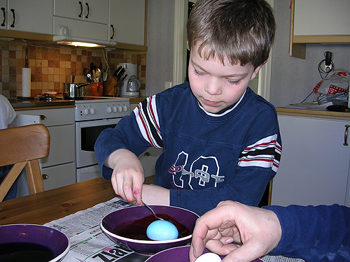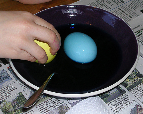 Spring hasn’t quite sprung, as the grass isn’t riz, but it’s surely on its way! See the egg in the 2nd picture? That’s EXACTLY what color the sky was today. Friends for dinner cancelled due to a sick child (theirs), so we took a leisurely day to enjoy the sunshine. The whole neighborhood seemed to ring like a bell with the shouts and laughter of children wearing fleece instead of heavy winter jackets and the sun was warm and welcoming. We went up to the nursery and brought home a flat of pansies, now proudly planted in the front-yard pots. And we colored eggs! Of course, we did! This year, a friend gave the kids a “Shake & Dazzle” kit, and we used that on about half a dozen, but the kids preferred the old-fashioned vinegar & food coloring dyes and spent a happy half hour turning the tips of their fingers purple and red. Today, Easter Eve, in Sweden, it’s estimated that SIX MILLION eggs are consumed. We actually didn’t eat any except the one Karin ate that cracked when she shook and dazzled a little too hard. But we’ll be making up for it tomorrow after the annual easter egg hunt in the park behind Malmö castle.