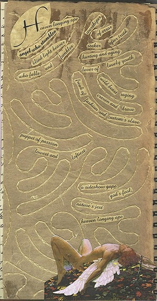 A great many of my favorite authors are also poets, and if they’re not poets, then they’re as wordsmithy AS poets, and often they use snippets and quotations and poetry in their books, to head chapters or reference or set a mood. This one is in the endpiece of Sheri S. Tepper’s Sideshow. She’s a favorite because her books are NEVER predictable. I like predictability in my real life (to a certain extent, and even to a CERTAIN extent, if you know what I mean) but I don’t like it in my reading.* Anyway, this poem struck me like a bell. I used it in one of the pages of my collage book as well.