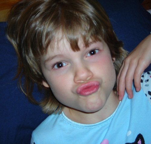 Karin cracks me up at bedtime. We have our little bedtime rituals each evening, which vary according to whether or not bathtime is involved, but no matter what when we go to tuck them into bed we say, “Good night, sleep tight, see you in the morning, I love you.” And the kids repeat it back to us both. And we give them a kiss and a hug. It’s a comfort and a prayer of sorts, I suppose. Karin insists on being kissed on the mouth and she puckers up for it. If you miss, deliberately or otherwise, she scrunches up her face and makes a “mmmmmmeee” noise through her kissylips to make sure you know you need to come back down and kiss her properly. She doesn’t relax her pucker until you’ve kissed her correctly and if you keep missing (and mooooom, how hard can it be?) she gets scrunchier and scrunchier. Which makes me laugh harder and harder until by the end I’ve kissed her all over her face and am leaning with my head on her chest fizzing from the giggles while she patiently, if eye-rollingly, waits for me to behave, with her lips still perfectly puckered up. Hee!