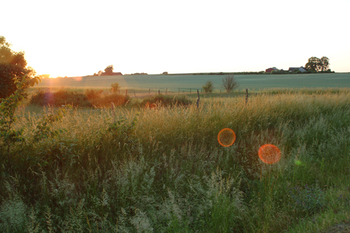 No clouds above, the sky is pure pale blue, its hem touched with lavender, with rose, with gold. The sun slants shadows long across the grass. Shadow trees with flickering leaves. Every country road is lined with tall, feather-tassel-topped grasses, bowing in the wind of the car’s passing. They dance a subtle sine-wave both fore and aft. Insects buzz and skip and copulate, it’s their season and they know it, though everything is green and lush, they’ve not eaten their fill yet. Bright red poppies, like drops of blood, like sun-kissed rubies, stitch up the edges of all the fields; imagine if it were the other way round: fields of poppies edged in wheat and timothy.
