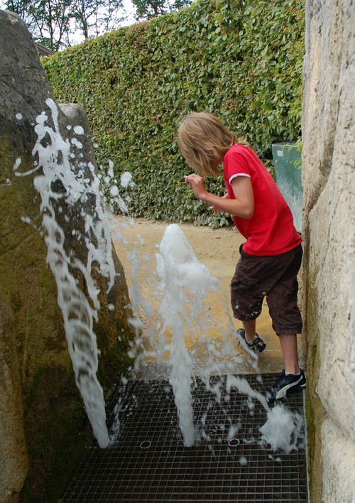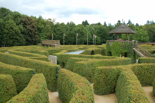 Karin found a souvenir machine that flattened and imprinted a 50 euro-cent coin with an image of the Drielandenpunt for 1 euro (but which really leaves you out 1.50: actual example of evil genius, to my way of thinking), and then we ate lunch at the tavern by the point. After that we paid to enter the Drielandenpunt Labyrinth and got thoroughly lost and turned about for an enjoyable 40 minutes or so, walking down the twisty beech hedge paths, dodging water fountain barriers and climbing up yet another of the 3 wooden bridges (or the same one 3x, who knows), trying to reach the middle of the labyrinth.